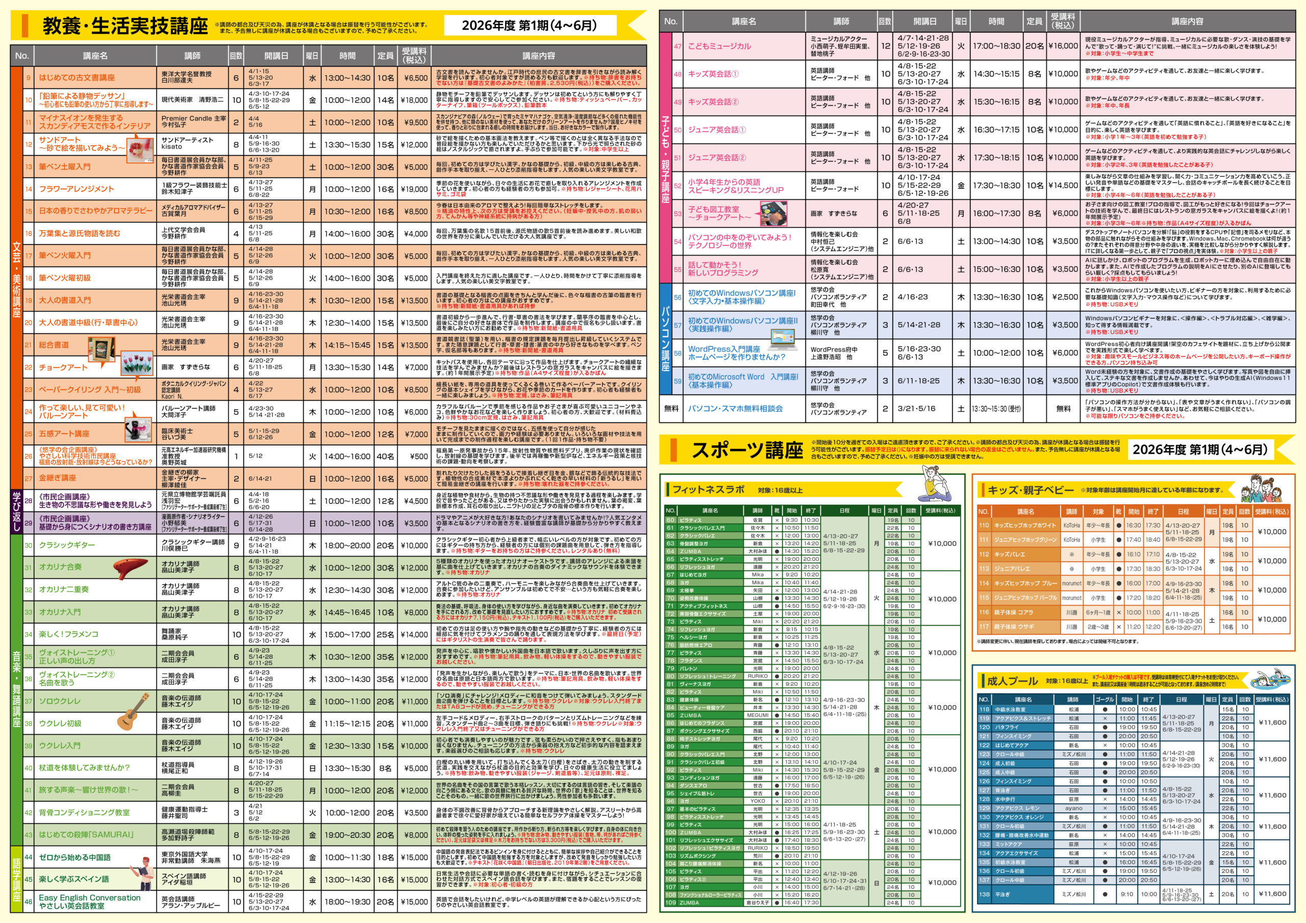 ※時間に遅れた方は、同日10時30分より総合受付前にて随時募集申し込みとなり、空きのある講座のみ先着順で受け付けます。